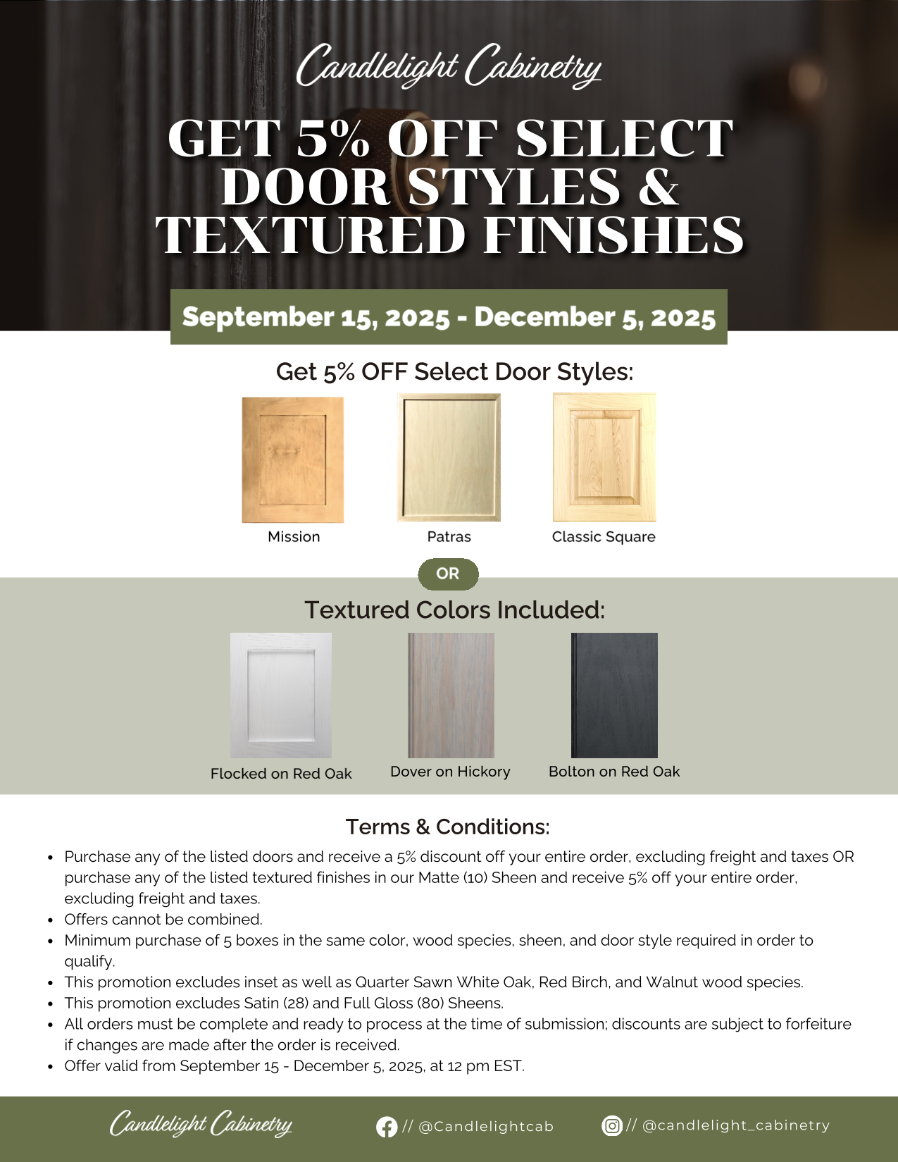 Promotions Current promotions being ran by our suppliers Sale from Candlelight From Candlelight Cabinetry thru December 5th Viatera Quartz Special Pricing for 9 colors of VIATERA Quartz! Appointment Request